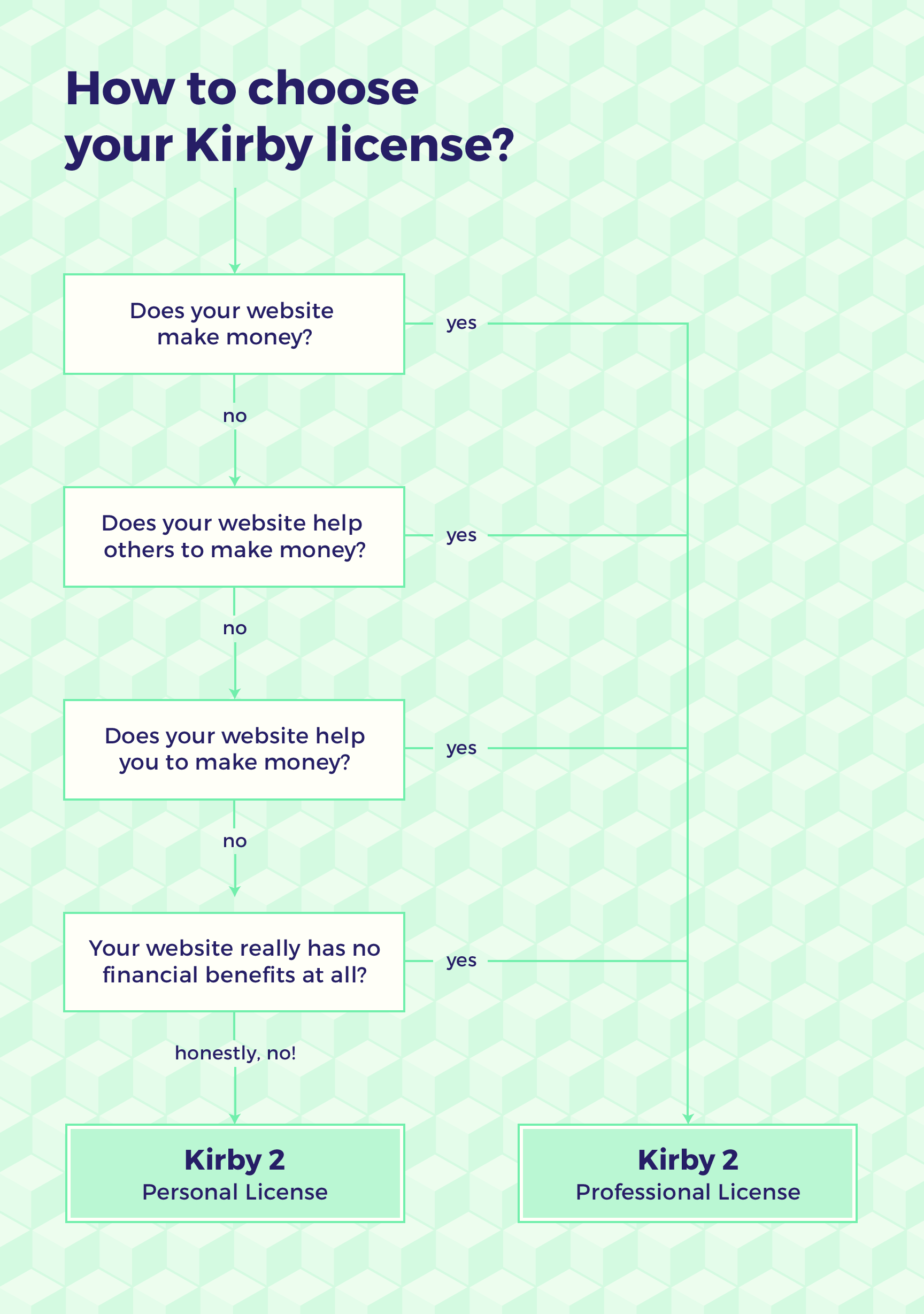 To keep Kirby affordable for as many people as possible, we have decided to make it available under a personal and a commercial license. The personal license may be used for personal / non-commercial projects only. The following chart may be helpful for you to decide which license is the right one for your project.